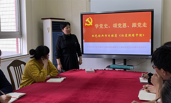 今年是中国共产党成立100周年,常州市天宁区红梅中心幼儿园联合党支部开展了内容丰富的党史学习教育。4月23日是常州解放日,也是第26个世界读书日,党支部组织全体党员教师和团员教师开展了“学党史、颂党恩、跟党走 ”红色经典书目推荐活动。